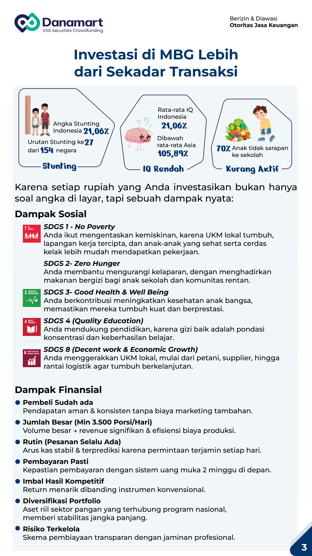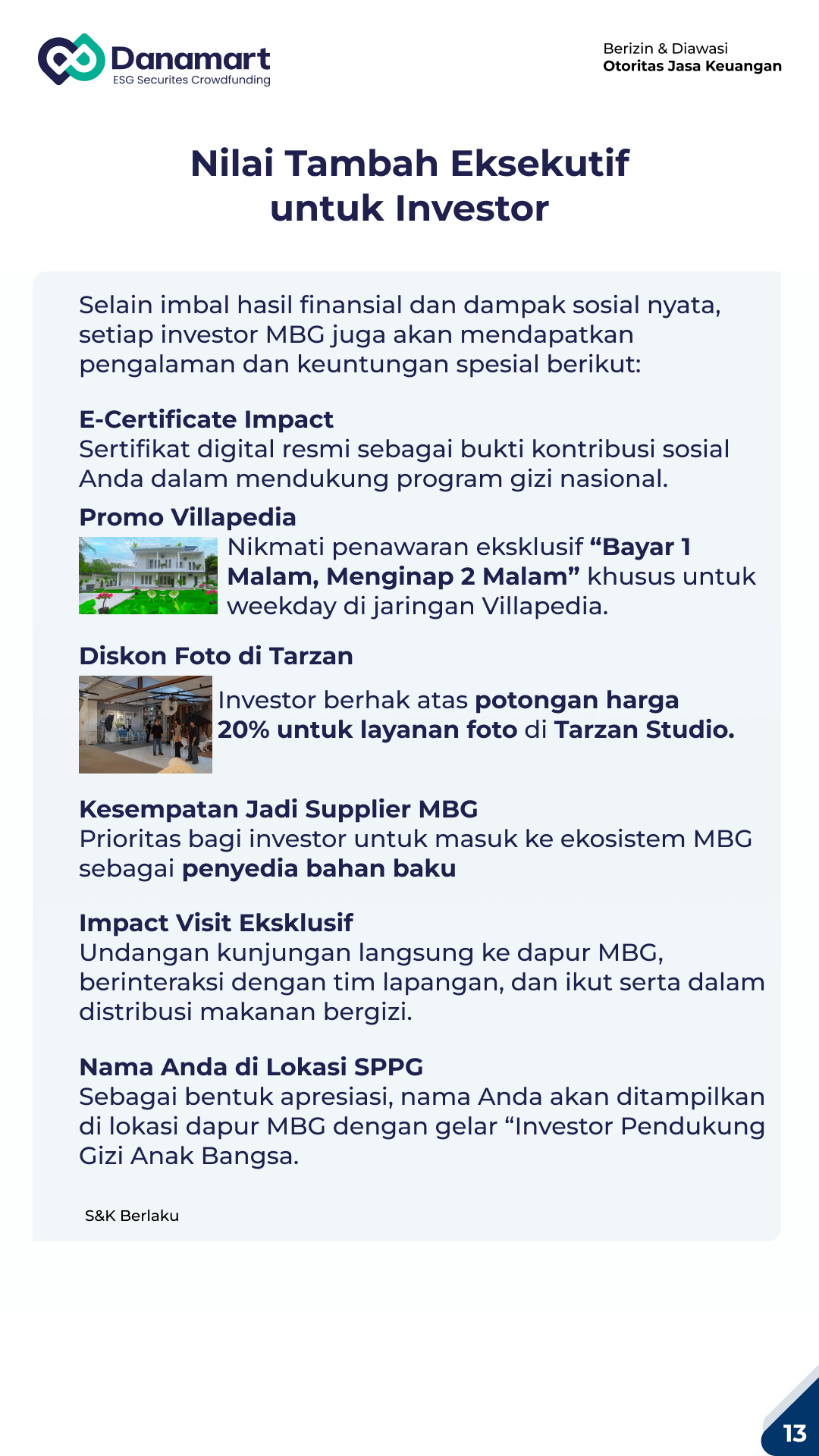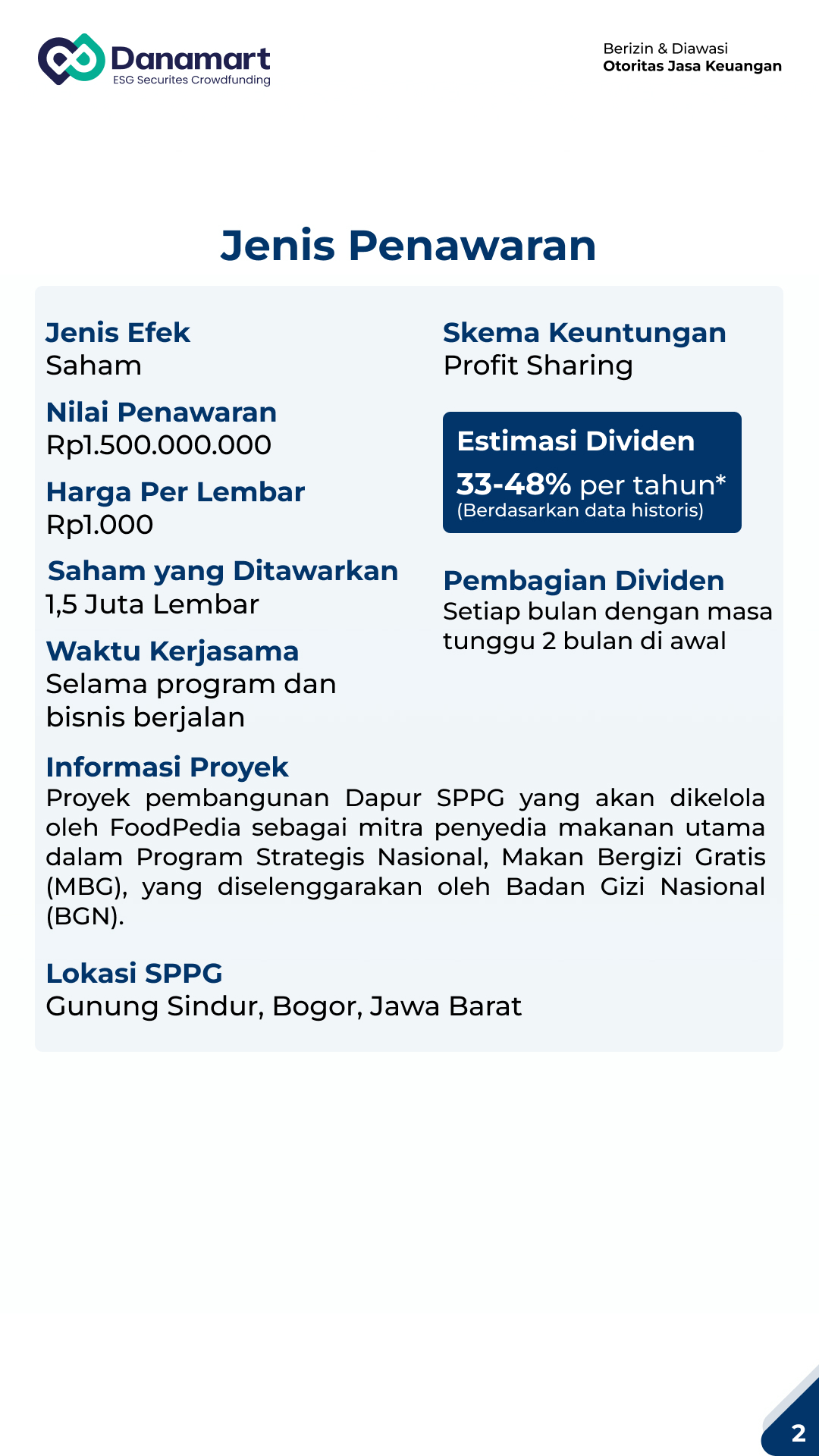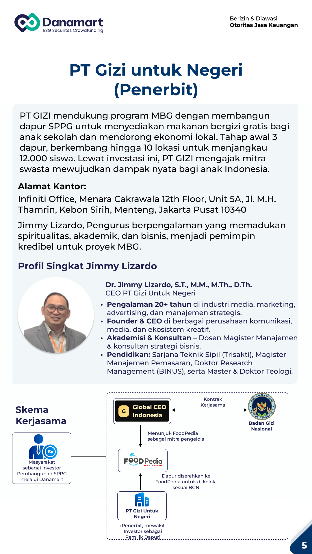 investor.id - Danamart, Penyelenggara Securities Crowdfunding berizin Otoritas Jasa Keuangan (OJK), resmi menandatangani Nota Kesepahaman (MoU) dengan Yayasan Global CEO Indonesia untuk mendukung Program Nasional Makan Bergizi Gratis (MBG) melalui proyek perdana Dapur SPPG Gunung Sindur. Kolaborasi ini lahir dari semangat crowdfunding untuk rakyat, oleh rakyat, di mana masyarakat dapat memiliki bagian dari bisnis berdampak sosial mulai dari Rp 1 juta.