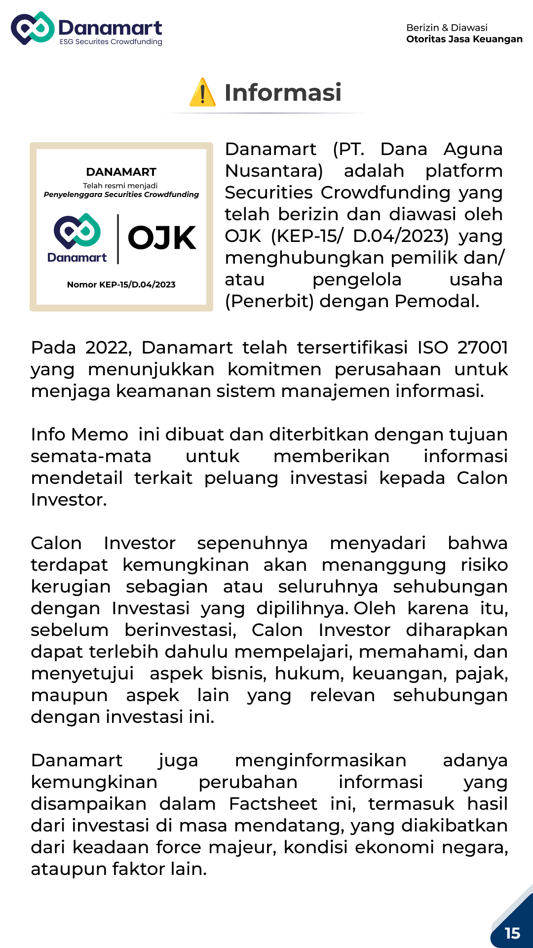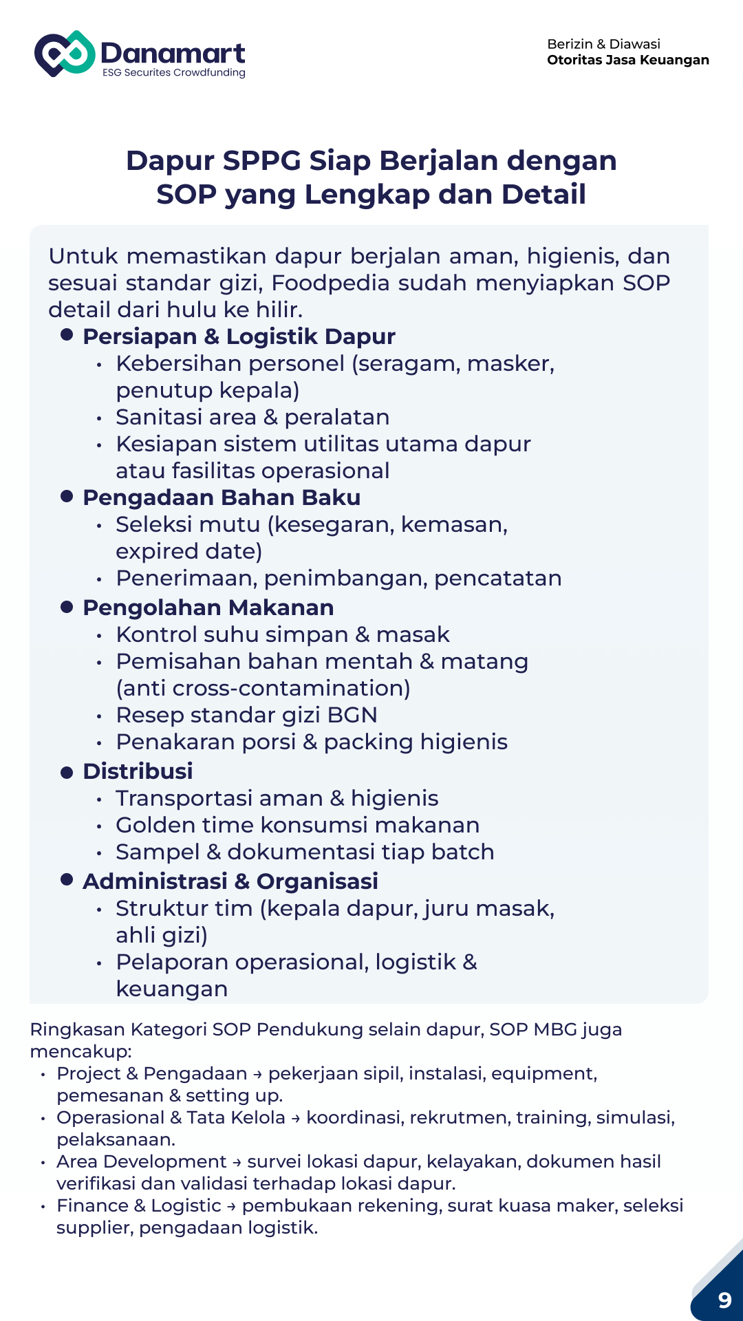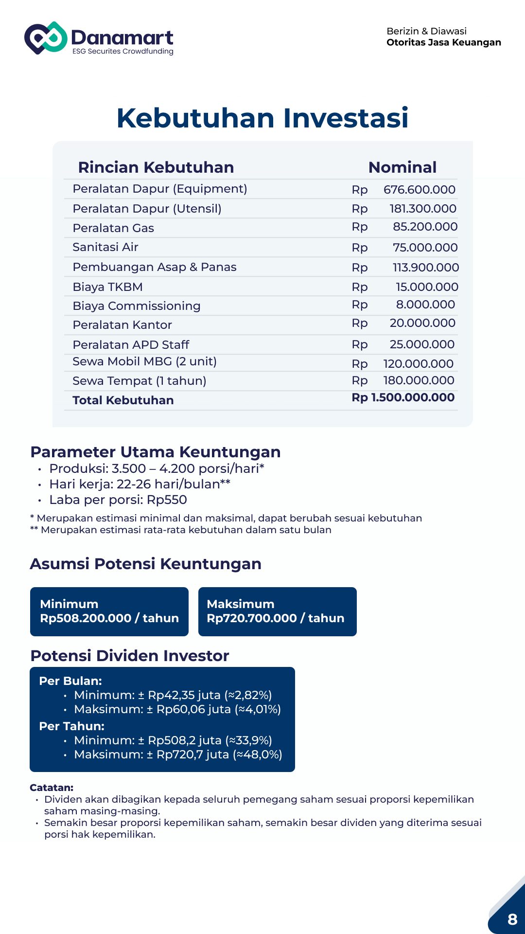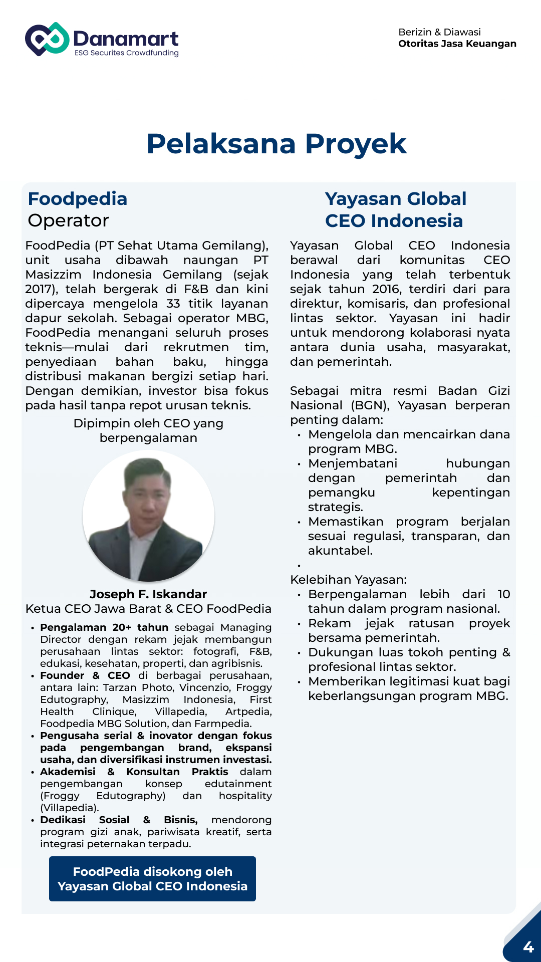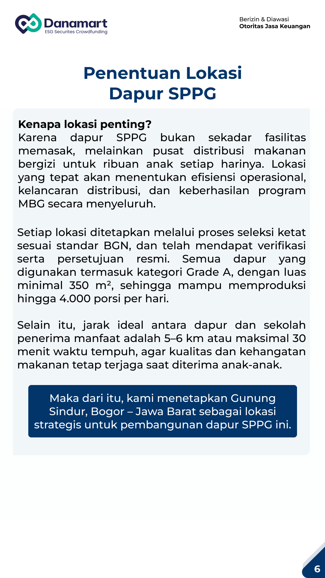 investor.id - Danamart, Penyelenggara Securities Crowdfunding berizin Otoritas Jasa Keuangan (OJK), resmi menandatangani Nota Kesepahaman (MoU) dengan Yayasan Global CEO Indonesia untuk mendukung Program Nasional Makan Bergizi Gratis (MBG) melalui proyek perdana Dapur SPPG Gunung Sindur. Kolaborasi ini lahir dari semangat crowdfunding untuk rakyat, oleh rakyat, di mana masyarakat dapat memiliki bagian dari bisnis berdampak sosial mulai dari Rp 1 juta.